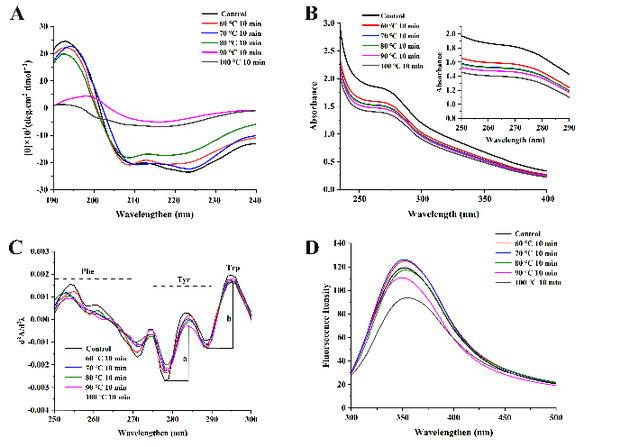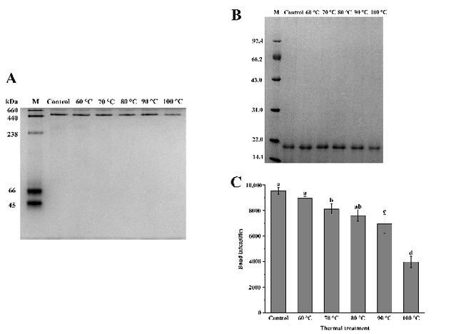 NPLF作为一种新来源的铁蛋白,与豌豆种子铁蛋白、大豆铁蛋白和其他植物铁蛋白相比,它更加稳定。在本研究中,我们发现热处理温度会不同程度的影响铁蛋白的结构和自组装能力。当处理温度低于80°C时,不影响铁蛋白的笼状结构和自组装能力,同时还会抑制NPLF的聚集。然而,随着温度的升高,会影响铁蛋白的自组装能力,破坏蛋白的结构,导致铁含量显著下降。因此,为实现NPLF的有效利用,其加工温度应控制在80°C以下。