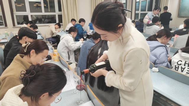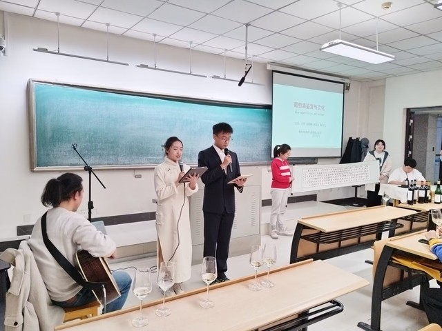 王平老师精心设计课程内容和实践环节。品鉴课上,同学们亲自操作开酒、倒酒、品酒、碰杯等葡萄酒礼仪。部分同学侍酒、赋诗,进一步增加学生的体验感、氛围感,将前面的很多理论知识学以致用。在老师的组织下,课堂上不仅有丰富的葡萄酒和葡萄酒文化,伴随着歌唱声还有石大学子的吉他伴奏、挥毫泼墨,提升学生审美趣味和历史文化素养。“葡萄酒是个健康的、时尚的东西,也是一种文化,希望能通过这门课给同学们传递一个新的生活体验、生活方式:要健康,要时尚。”面对20余种企业提供的葡萄酒,王老师讲解了酿酒原料品种、葡萄酒产地和等级,以及不同价位对应的具体质量,让同学们对葡萄酒有了全新的认知,在体验品鉴葡萄酒的同时,鼓励大家体验丰富多彩的生活。