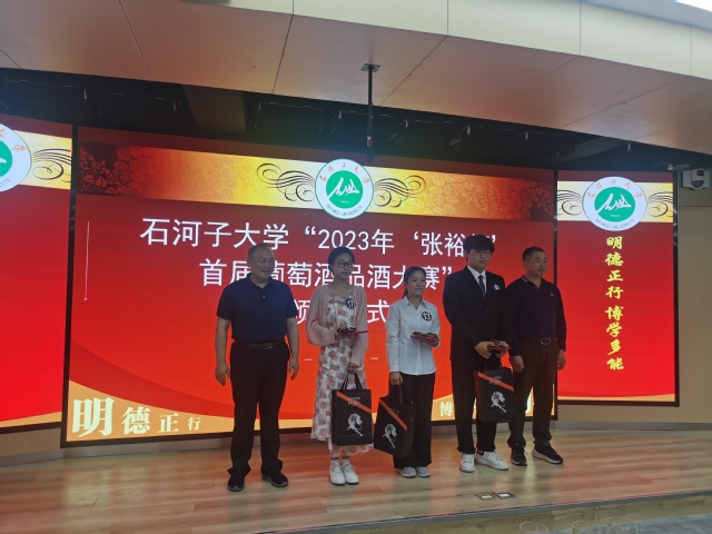 李玲副处长在致辞表示,石河子大学一直秉承着“一院一特色”的学科竞赛理念,此次“张裕杯”葡萄酒品酒大赛,是联合企业合办的“一专业一特色”的首次尝试,在校内引起师生的较大反响,希望葡萄酒品酒大赛越办越好、越办越丰富。进入决赛的18位学生在决赛环节,通过葡萄酒盲品、酒评撰写和综合陈述等专业环节,经过2个多小时的激烈角逐和现场评委专家的综合评定,周婷(2020级动物医学专业)、袁敬博(2021级药学专业)、高煜(2019级葡萄与葡萄酒工程专业)等3人获得特等奖,程姜琳(2020级水利水电工程专业)、汤子雄(2021级设施农业科学与工程专业)、张婉婷(2021级预防医学专业)、谭雅文(2021级汉语言文学专业)、钟晨晓(2019级葡萄与葡萄酒工程专业)等5人获得一等奖,其余10位同学获得二等奖、45位同学获得三等奖。张裕巴保男爵酒庄为大赛提供了特色葡萄酒、酒庄门票等作为奖品,与会领导、专家和嘉宾为获奖学生进行了颁奖。至此,历时50余天的石河子大学2023年“张裕杯”首届葡萄酒品酒大赛圆满闭幕。