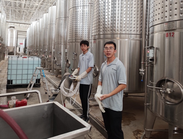 8月24日,巴州焉耆县中菲酒庄举行了酿酒葡萄采收和葡萄酒开榨仪式,来自食品学院2020级葡萄与葡萄酒工程系的张雨桐、孙兆悦和王聪俐三位同学,和中菲酒庄的员工在葡萄穗选台紧张有序的挑选葡萄。在博湖县磬玉酒庄,雷晶皓、金亚楠等两位同学在发酵车间紧张忙碌的冲洗发酵罐。在和硕县国菲酒庄,齐亚鹏、栗浩、贠慈君和王雪凝等四位同学,在酿酒葡萄基地采样测定葡萄质量。在和硕县西丹酒庄和冠龙酒庄,陈虹宪、随赛辉、李乐信、侯新建、郭靖怡和李雪瑞等六位同学积极在酒庄灌装车间参与灌装成品酒,至此食品学院2020级葡萄与葡萄酒工程专业生产实习正式拉开帷幕。