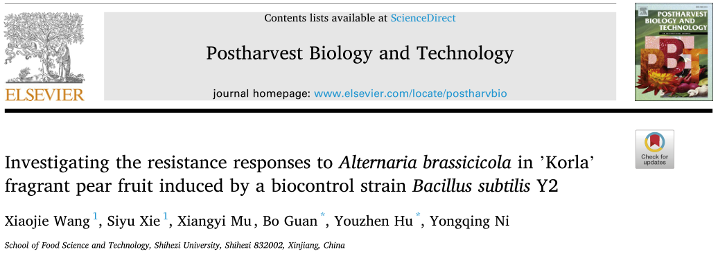 库尔勒香梨(Pyrus siniangensis Yü)被誉为“中国蜜梨”和“水果王子”,是主要种植在中国西部新疆库尔勒地区的传统品种。“库尔勒”香梨果实经济价值显著,然而采后病害,特别是由链格孢菌引起的黑头病,在贮运和销售过程中造成较大损失。通过拮抗微生物进行生防控制是减少果实采后腐败的一种环境友好且有效的方法。生防微生物通过营养和空间的竞争、水解酶和抗真菌化合物的合成以及生物膜的形成的方式直接抑制病原菌,或者通过系统获得性抗性(SAR)和诱导系统性抗性(ISR)控制采后病害。芽孢杆菌作为一类重要的拮抗微生物,被认为是开发水果采后生防制剂的重要候选微生物,但不同枯草芽孢杆菌菌株的拮抗活性、抑菌谱以及在不同果实上的采后生防效果均存在较大差异。