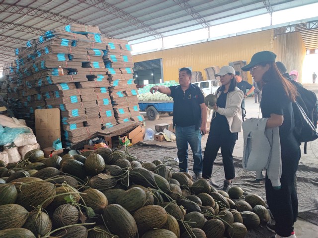 在玉门市玉珑种植农民专业合作社,张伟达博士一行参观了蜜瓜分选中心,详细了解了蜜瓜清洗分选包装流程的运作过程。在参观过程中,合作社技术总监尚志鹏分享了发展蜜瓜设施化种植的心路历程,并就蜜瓜贮藏运输过程中遇到的瓜柄易枯萎、发霉等问题提出了技术诉求,希望通过食品学院这一科研平台解决生产过程中的问题,降低农产品资源的浪费,维护企业形象。张伟达博士表示科研团队将通过模拟实际贮藏运输中的条件,基于采后生理学和病理学,对致病菌、果实贮藏品质性状展开针对性研究,力求帮助企业解决生产实践中的痛点问题。