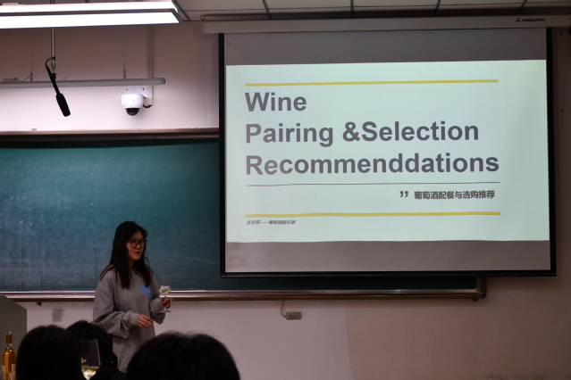 张李晶带领同学们品尝了添加味精、食盐、白砂糖以及柠檬后的葡萄酒,体验了不同呈味物质对葡萄酒口感变化的影响。大家推杯换盏,觥筹交错,不亦乐乎。随后张李晶分享了葡萄酒的配餐和选购推荐等相关知识。