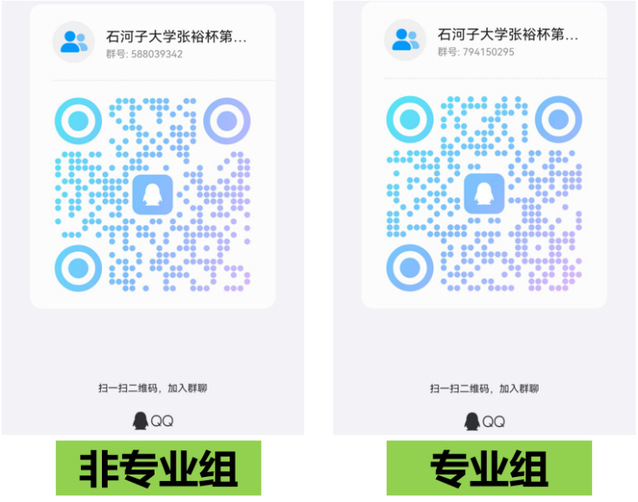 报名时间为即日起至2024年3月30日。参赛选手务必于截止日期加入竞赛报名群(请扫描以下二维码加群),填写群内线上报名表。进入报名界面后,参赛选手须如实填写本人姓名、学号、学院、专业、组别等信息,确认提交完成报名。填报信息与竞赛成绩、获奖证书挂钩,如果填报错误或经核查不实,将可能被取消竞赛成绩。
