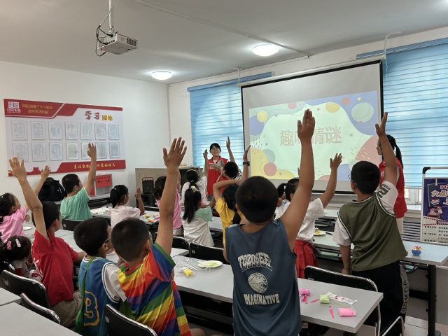 前期的宣传工作准备充分,7月12日下午6时,活动场地涌来了大批积极前来参加“七彩红柳六点半”趣味课堂的小朋友。在本次课堂中,团队成员准备了制作酸奶、食品类趣味猜谜和太空泥等活动。课堂开始后,团队成员首先展示酸奶的制作过程,“在酸奶的制作中将酸奶与牛奶混合,请小朋友告诉我,两者谁的比例更大呢……”“酸奶!”小朋友们争先恐后地回答,团队成员热情地与小朋友们互动。