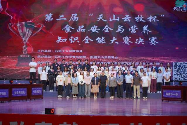 9月7日,石河子大学北区大会堂灯光如昼、掌声雷动,由石河子大学教务处主办,新疆天山云牧乳业有限责任公司、食品学院承办的第二届“天山云牧杯”食品安全与营养知识全能大赛在此迎来终极对决。从线上万人海选、实操技能沙场,到短视频创意答辩,8支“学霸战队”一路过关斩将,最终站上最高擂台,用知识与激情献上了一场“舌尖上的巅峰盛宴”。