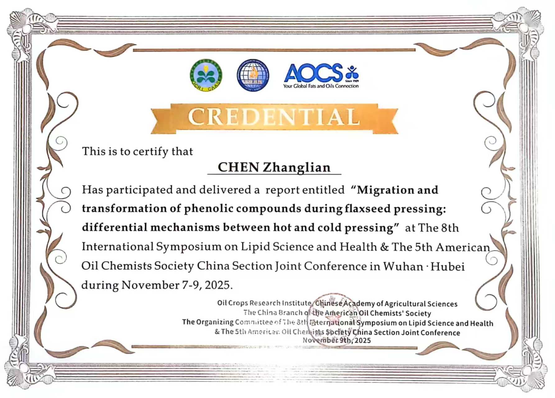 2025年11月7日至9日在湖北武汉召开“第八届国际脂质科学与健康学术年会暨第五届美国油脂化学家协会中国分会年会”,此次会议由中国农科院油料作物研究所联合美国油脂化学家协会中国分会等单位联合主办。作为脂质科学领域极具影响力的国际学术交流平台,本次会议以“新质生产力赋能脂质 & 蛋白质产业可持续发展”为主题,汇聚了全球16个国家的知名专家学者、行业精英及青年科研人员,共同探讨脂质科学与健康领域的前沿进展与产业趋势。bat365在线中文官方网站粮油技术研究中心硕士研究生陈章莲参会,并在研究生论坛作题为《亚麻籽压榨过程酚类化合物的迁移与转化:热榨与冷榨的差异机制》专题学术报告,系统分享了团队在亚麻籽加工过程中功能成分转化机制方面的最新研究成果,引发与会专家广泛关注。