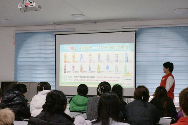 活动现场,志愿者王家治结合精心准备的PPT,围绕“控盐减糖”“食品标签解读”等实用内容展开宣讲。在“人人控盐·盐多必失”板块,王家治用“健康成年人每日食盐不超过5克(约一个啤酒瓶盖量)”的直观标准,搭配“少用酱油、味精等隐形盐调料”的具体建议,让居民快速掌握控盐技巧;而“‘糖’衣炮弹——饮料中的含糖量”展示则通过常见饮品的糖分对比,依托《中国居民膳食指南2022》的健康标准,提醒大家减少添加糖摄入。讲解中,志愿者还设置“配料表怎么看”互动环节,手把手教居民识别“三无产品”与高盐高糖食品,将专业知识转化为生活技能。