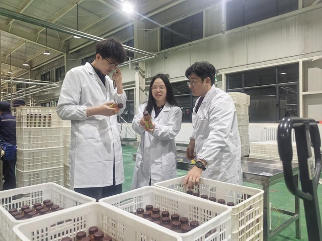 在生产车间,指导团队与企业技术人员、操作工并肩作战,经实地勘察、数据监测及现场实操,排查生产全流程问题。团队立足党支部技术聚合优势,结合果蔬加工技术研究中心最新科研成果,创新提出“优化原料配比+改进温控工艺”方案,现场演示核心设备调试技巧、手把手指导员工掌握关键技术,并围绕安全规范、质量管控与企业管理层研讨,提供科学实操的改进建议。一周内,企业成功突破技术瓶颈,完成 5 吨枣杞畅清饮、5 吨枣杞养元饮的生产。
