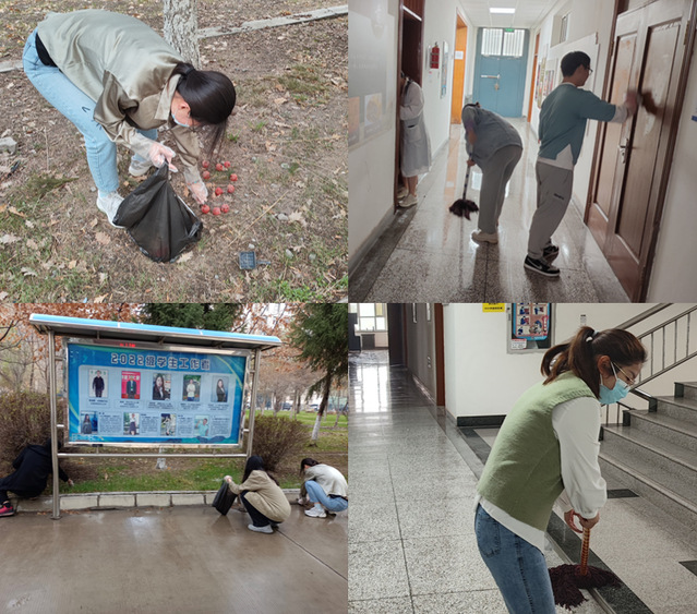 同志们干劲十足,手拿拖把、抹布、垃圾袋等工具,擦拭门窗和墙面,清扫灰尘、捡拾垃圾,以认真的态度,仔细地清洁着自己负责的区域,在劳动中树德、强体。经过大家三个小时劳动,使学院面貌焕然一新。