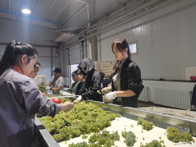 8月24日,巴州焉耆县中菲酒庄举行了酿酒葡萄采收和葡萄酒开榨仪式,来自食品学院2020级葡萄与葡萄酒工程系的张雨桐、孙兆悦和王聪俐三位同学,和中菲酒庄的员工在葡萄穗选台紧张有序的挑选葡萄。在博湖县磬玉酒庄,雷晶皓、金亚楠等两位同学在发酵车间紧张忙碌的冲洗发酵罐。在和硕县国菲酒庄,齐亚鹏、栗浩、贠慈君和王雪凝等四位同学,在酿酒葡萄基地采样测定葡萄质量。在和硕县西丹酒庄和冠龙酒庄,陈虹宪、随赛辉、李乐信、侯新建、郭靖怡和李雪瑞等六位同学积极在酒庄灌装车间参与灌装成品酒,至此食品学院2020级葡萄与葡萄酒工程专业生产实习正式拉开帷幕。