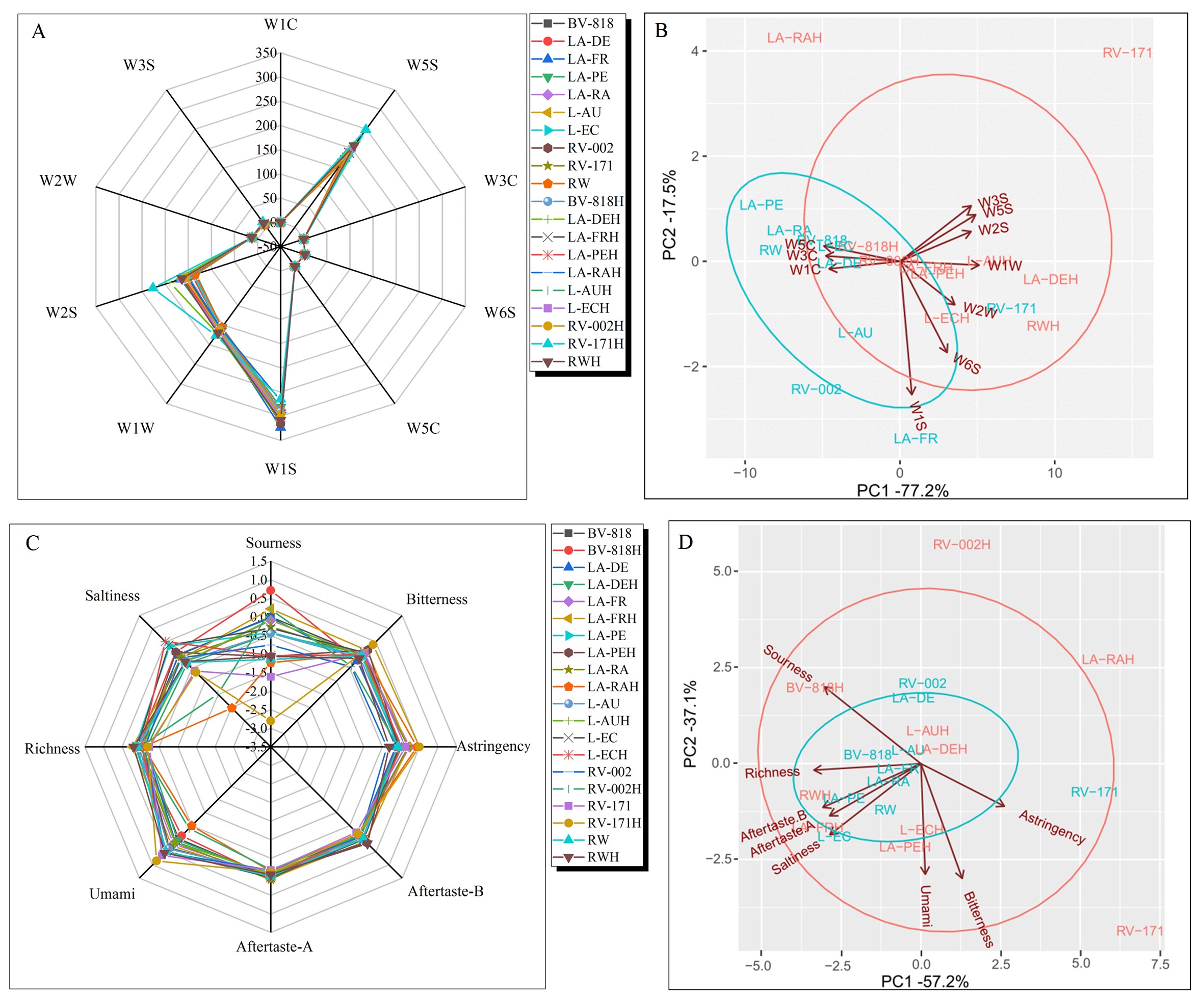 以酿酒酵母和酿酒酵母+地衣芽孢杆菌为研究对象,在相同的培养条件下制备红枣酒,研究了地衣芽孢杆菌与商业酿酒酵母共发酵对枣酒酿造的影响,以验证地衣芽孢杆菌在枣酒酿造中的可行性。采用常规分析、电子感官、HS-SPME-GC-MS等方法,研究了酿酒酵母单一发酵和地衣芽孢杆菌与商业酿酒酵母共发酵对枣酒化学成分、色泽、有机酸、氨基酸、口感和香气物质的影响,并基于多元统计分析构建发酵菌株与味觉活性化合物及挥发性物质之间的构效关系。