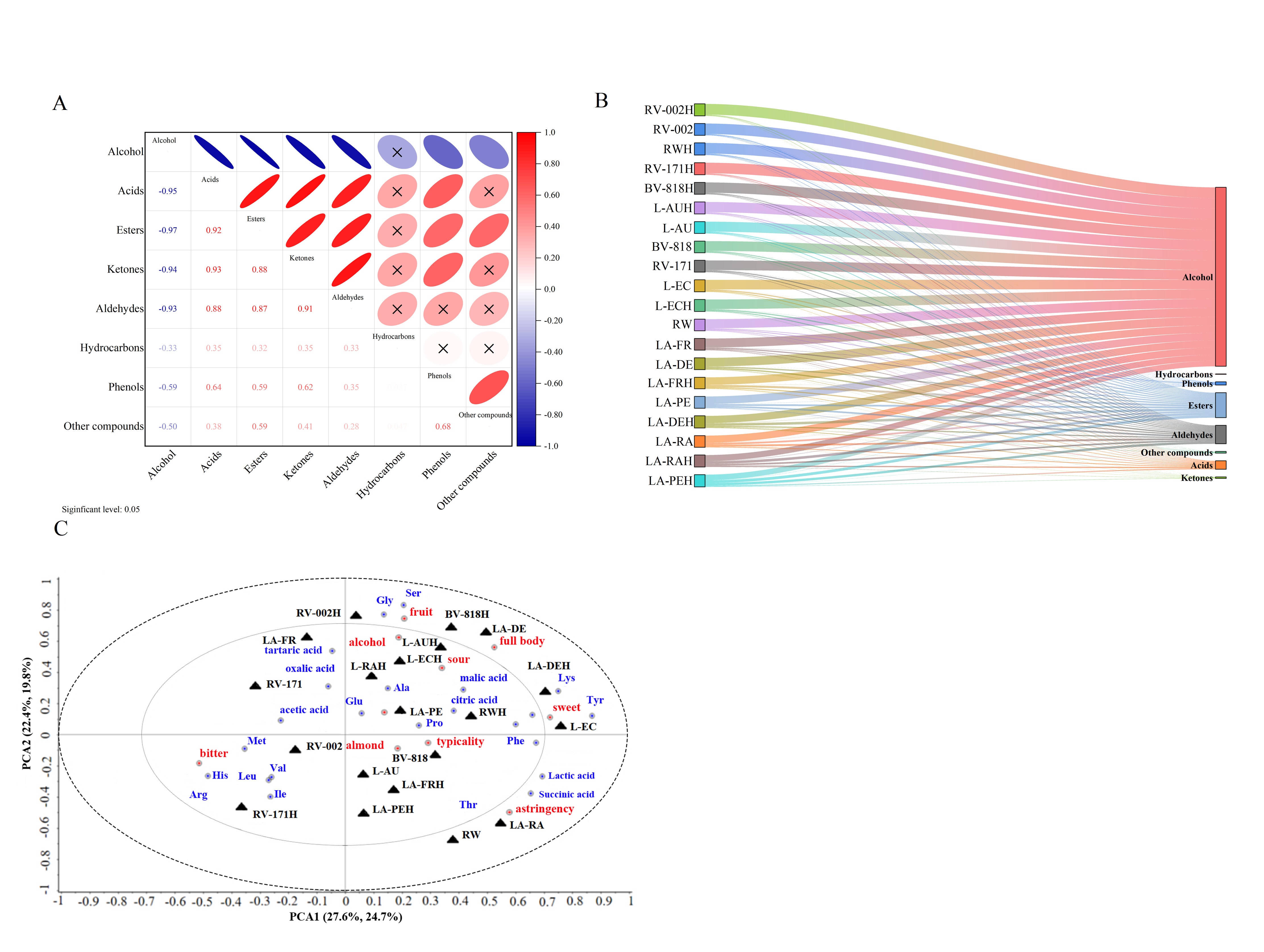 不同酵母菌发酵的红枣酒品质差异显著(p < 0.05),混合发酵枣酒具有更高的生物转化效率且色泽品质更佳。混合发酵的枣酒增强了包括萜烯、硫化物和醇类物质在内的挥发性化合物的强度,同时酸味、苦味和涩味更突出。偏最小二乘回归相关性分析表明,以甘氨酸、丝氨酸、脯氨酸、丙氨酸、谷氨酸、苹果酸和柠檬酸为代表的味觉活性物质对枣酒的特征口感贡献最大。11种风味化合物是枣酒中特征香气化合物,其中乙酸苯乙酯、乙酸异戊酯、辛酸乙酯、癸酸乙酯、辛酸和糠醛为枣酒提供玫瑰花香和果香。这些结果为枣酒的品质和风味形成提供了更好的理解,也为增强枣酒和其他发酵饮料的理想特性及弱化不良特征提供了有前景的见解。