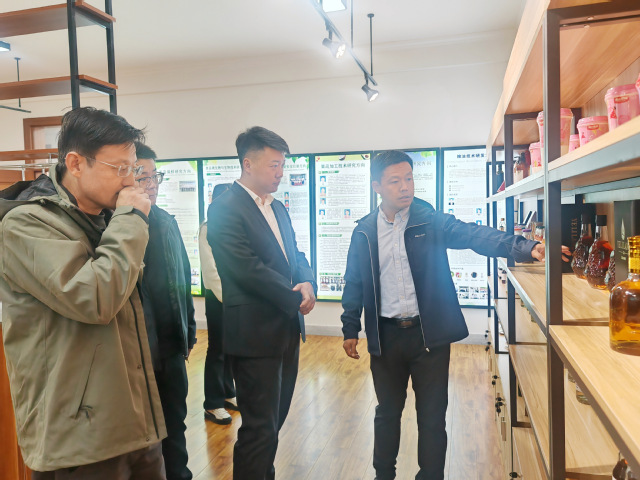 雷建鹏陪同左涛、郭晓岚一行参观了食品微生物与生物技术研究中心实验室及学院产品展览室,对中心的各个研究方向和学院产学研的成果产品进行介绍。