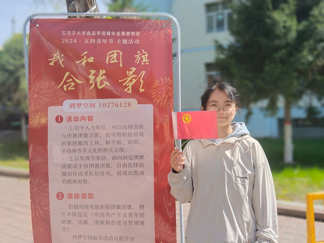 五四青年节来临之际,食品青协在全校范围内发起了“我与团旗共光辉”照片征集活动,鼓励同学们与团旗合影,以此表达对共青团精神的热爱和信仰。活动在石河子大学北区、中区等人流密集处设立宣传点,准备了国旗、团旗等道具,活动持续2天,共收集到130余份合影作品,涵盖了各学院和年级的学生。这些作品不仅展示了学生们的青春活力,也传递了“五四”精神的正能量。