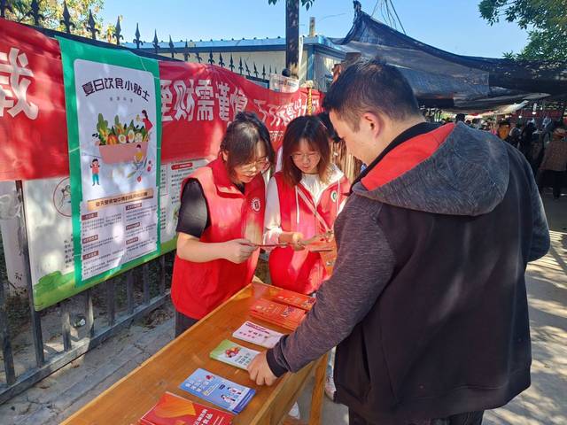 实践团成员结合丰富的专业知识,在早市发放宣传册,向居民们普及食品安全常识。