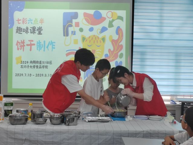 7月12日至13日,bat365在线中文官方网站赴八师石河子市31社区教育关爱实践团依托社区“七彩六点半”特色课堂,结合专业知识,向社区青少年开展趣味食品制作体验活动。