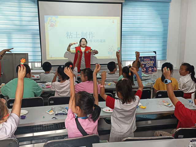 在酸奶与牛奶混合的过程中,成员邀请了两位小朋友一起参与酸奶的搅拌。在等待酸奶发酵的过程中,团队组织了食品类趣味猜谜和太空泥活动。趣味猜谜游戏让小朋友的脑袋飞速转了起来,小朋友们高高举起右手,口中大声回答着:“荔枝!”“香蕉!”“白桃!”。在太空泥制作中,团队成员给小朋友们设置了水果蔬菜的主题,小朋友们的手工作品丰富多彩,栩栩如生。