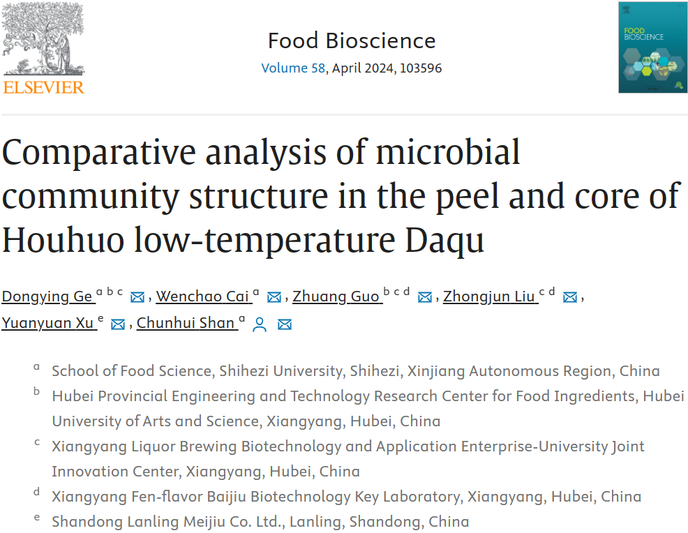 后火低温大曲的细菌属和真菌属主要由Bacillus(58.84%)和Saccharomycopsis(87.61%)构成。曲皮样品中真菌丰富度和多样性均非常显著低于曲心样品(P<0.01)。在细菌水平上,Sphingobium、Staphylococcus和Streptomyces在曲皮样品中显著富集(P<0.05),而Saccharopolyspora在曲心样品中显著富集(P<0.05)。在真菌水平上,Clavispora和Saccharomycopsis等酵母菌在曲皮样品中显著富集(P<0.05),而Monascus和Aspergillus等霉菌在曲心样品中显著富集(P<0.05)。曲块部位的不同对于细菌属相关性的影响大于真菌属,且曲皮样品中微生物的网络更加紧密。曲皮和曲心中亦存在共有的微生物类群,共有的细菌属为Bacillus、Saccharopolyspora、Streptomyces和Staphylococcus,共有的真菌属为Saccharomycopsis和Monascus。通过纯培养发现,B. paralicheniformis(33.91%)、P. pentosaceus(19.54%)和S. fibuligera(31.03%)分别是所有样品中含量最多的芽孢杆菌、乳酸菌和酵母菌菌株。本研究丰富了对曲皮和曲心中微生物菌群结构的认识,为后续制曲工艺的优化和酿酒微生物菌株的筛选提供了数据支撑。