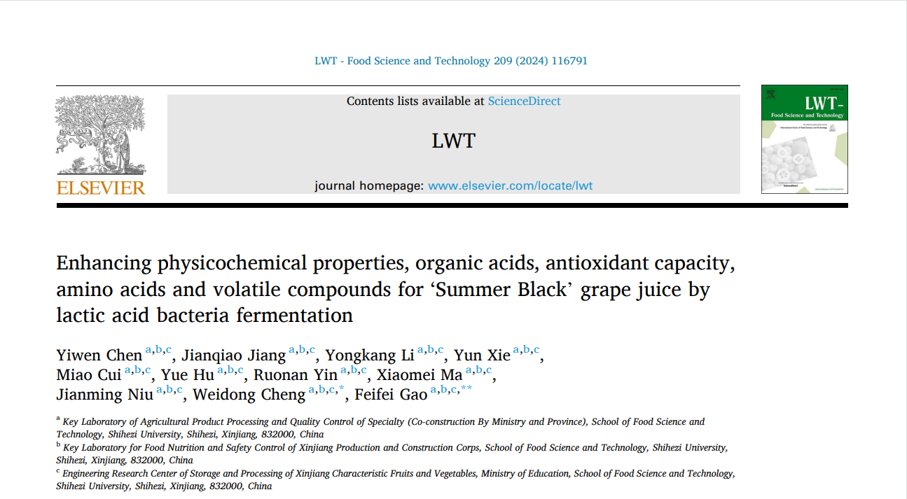 近日,食品学院高飞飞副教授指导研究生在LWT-Food science and technology(中科院一区Top,IF=6.0)发表了题为“Enhancing physicochemical properties, organic acids, antioxidant capacity, amino acids and volatile compounds for ‘Summer Black’ grape juice by lactic acid bacteria fermentation”(通过乳酸菌发酵提高“夏黑”葡萄汁的有机酸、抗氧化能力、氨基酸和挥发性化合物的含量)的原创性研究论文。