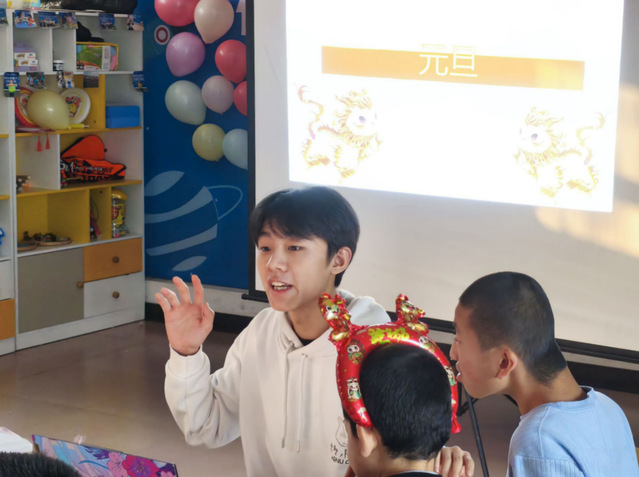 志愿者李国傲为小朋友们讲述各种新年故事,小朋友们听得入神,积极互动,在故事中感受年俗魅力,拓展认知边界。