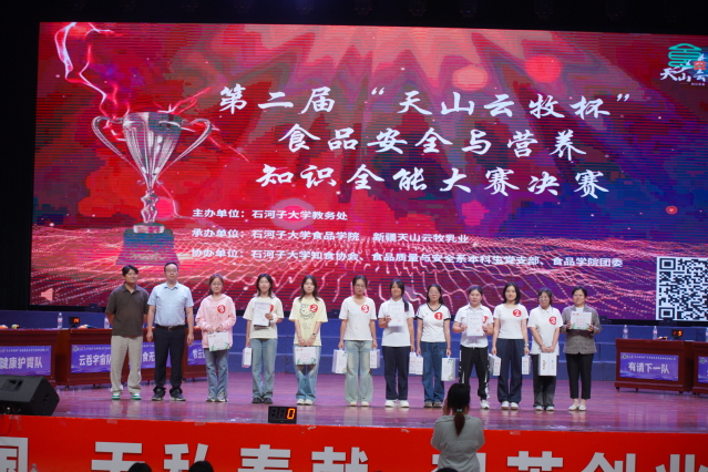 9月7日,石河子大学北区大会堂灯光如昼、掌声雷动,由石河子大学教务处主办,新疆天山云牧乳业有限责任公司、食品学院承办的第二届“天山云牧杯”食品安全与营养知识全能大赛在此迎来终极对决。从线上万人海选、实操技能沙场,到短视频创意答辩,8支“学霸战队”一路过关斩将,最终站上最高擂台,用知识与激情献上了一场“舌尖上的巅峰盛宴”。