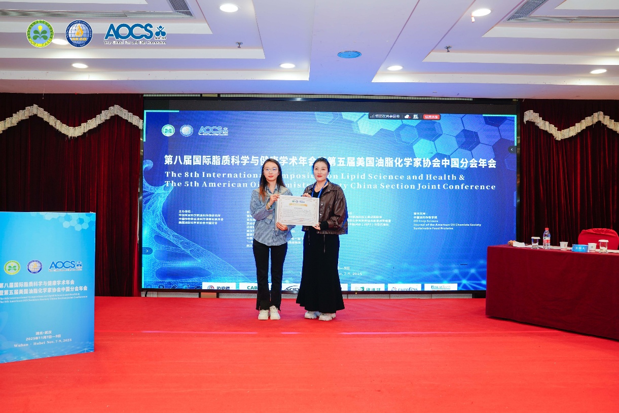 2025年11月7日至9日在湖北武汉召开“第八届国际脂质科学与健康学术年会暨第五届美国油脂化学家协会中国分会年会”,此次会议由中国农科院油料作物研究所联合美国油脂化学家协会中国分会等单位联合主办。作为脂质科学领域极具影响力的国际学术交流平台,本次会议以“新质生产力赋能脂质 & 蛋白质产业可持续发展”为主题,汇聚了全球16个国家的知名专家学者、行业精英及青年科研人员,共同探讨脂质科学与健康领域的前沿进展与产业趋势。bat365在线中文官方网站粮油技术研究中心硕士研究生陈章莲参会,并在研究生论坛作题为《亚麻籽压榨过程酚类化合物的迁移与转化:热榨与冷榨的差异机制》专题学术报告,系统分享了团队在亚麻籽加工过程中功能成分转化机制方面的最新研究成果,引发与会专家广泛关注。