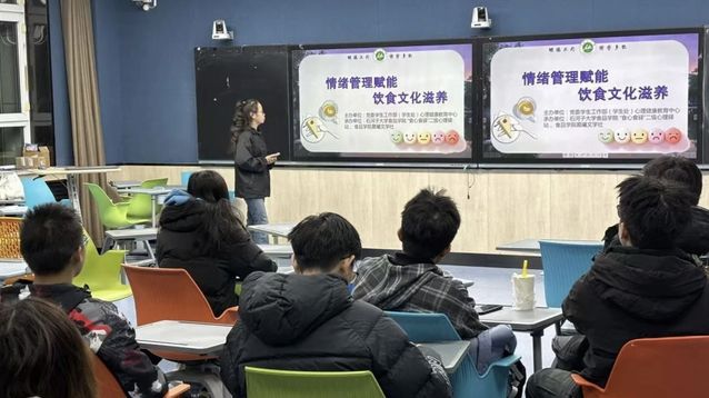 演讲过程中,PPT以图文结合的形式将专业知识具象化,心理委员的主持则兼顾节奏与互动,让原本抽象的营养心理学知识变得易懂、实用,现场同学不时提笔记录,将“食愈”技巧纳入自己的生活清单。