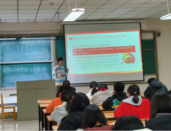 全体学生齐唱团歌《光荣啊,中国共青团》后,宣讲者蒿博韬为同学们梳理了全会的基本情况,特别强调了“十五五”时期在现代化进程中的关键地位。随后通过详实的数据,在重点内容讲解环节展示了“十四五”时期我国在经济发展、科技创新、粮食安全、民生改善等领域取得的显著成就。