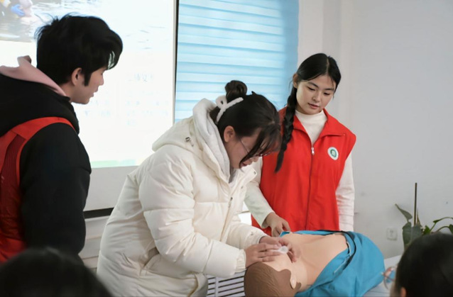 随后,医学院“红十字”志愿者协会的志愿者借助人体模型,完整演示了如何进行心肺复苏的全过程,从“观察周围情况是否安全”到“完成5个急救循环”,每一个步骤都讲解的非常细致、示范的非常标准。大家不仅听的认真,还积极踊跃地上前尝试。此互动环节不仅掌握了心肺复苏的技巧,还让大家切实提升了应急处置的实操能力。
