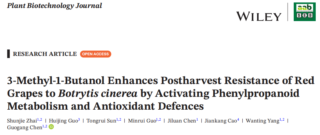 近日,bat365在线中文官方网站果蔬贮藏保鲜技术研究中心陈国刚教授团队在葡萄采后病害防治及抗性机制研究方面取得重要研究进展,研究成果以“3-Methyl-1-butanol enhances postharvest resistance of red grapes to Botrytis cinerea by activating phenylpropanoid metabolism and antioxidant defenses”为题,发表于TOP期刊《Plant Biotechnology Journal》(中科院1区,IF=10.5)。