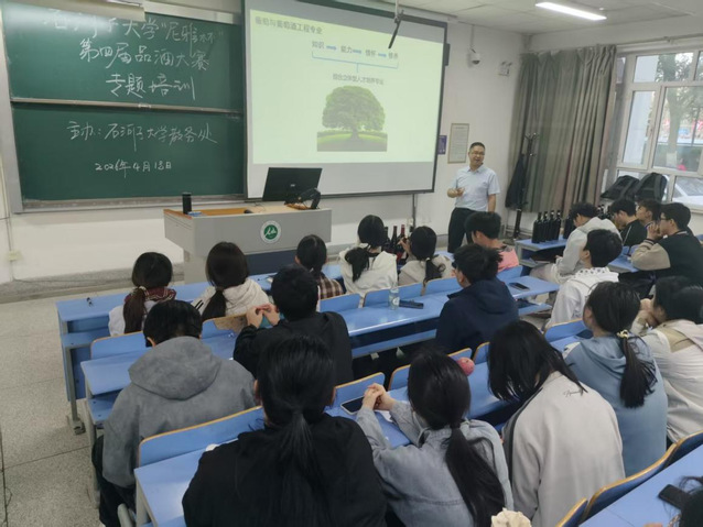 “一杯琼浆藏深韵,满堂学子探真知。”4月18日,石河子大学“尼雅杯”第四届葡萄酒品酒大赛初赛专题培训在北区绿3-102教室正式开课,标志着“尼雅杯”第四届葡萄酒品酒大赛正式启动,本次比赛共吸引22学院74专业近600余名学生报名参与,培训在线上线下同步进行。